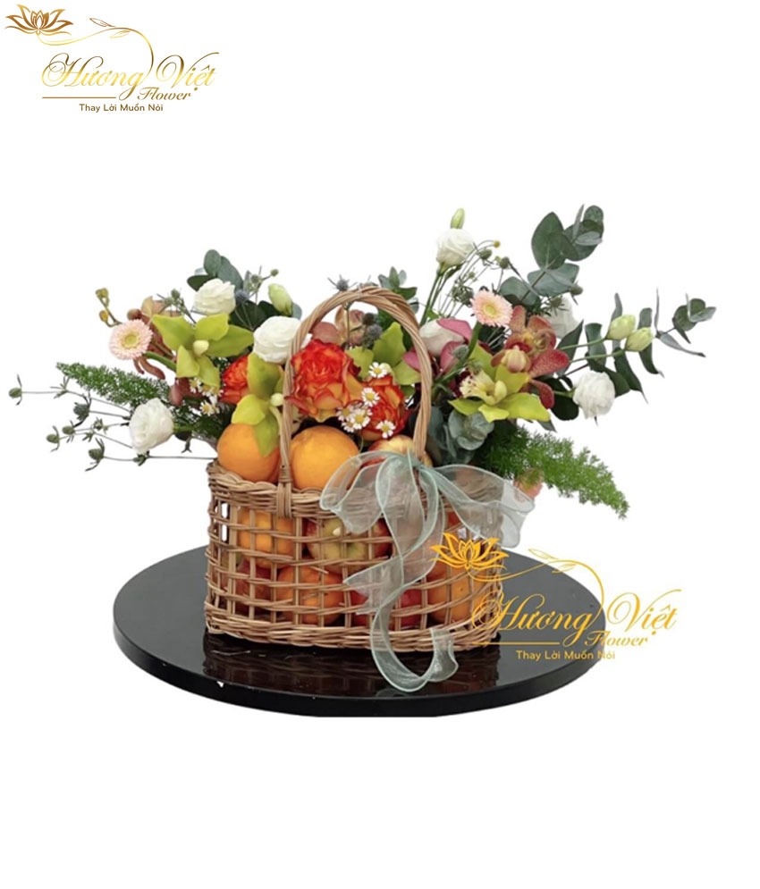 - Sản phẩm gồm: 2 quả Lê Hàn Quốc, 6 quả Táo Mỹ đỏ, 2 quả Táo Mỹ xanh, 1 kg Nho Mỹ, 1 quả Xoài, 1 quả Dưa Lưới, 1 quả Cam Mỹ kết hợp cùng hoa lá.